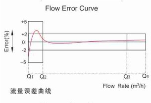 b、從包括分界流量(Q2)在內到包括過載流量(Q4)的高區中的更大允許誤差是±2%